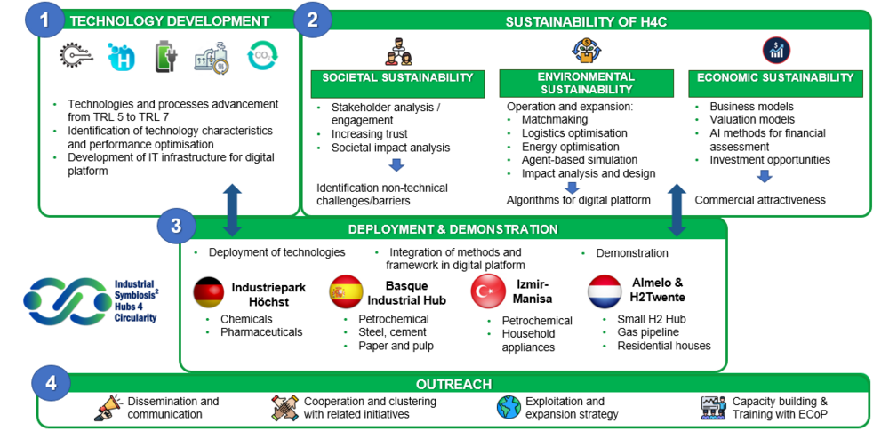 Existing heavily industrialized areas are currently incapable of adopting large-scale industrial symbioses in terms of shared technology/infrastructure use, waste integration, energy and material utilization, as well as expanding through surrounding ecosystems in an inclusive manner for the society despite many of the EU's key strategic priorities in sustainable regional development. Within this context, IS2H4C proposes an ambitious and efficient innovation and action workplan to develop several solutions for the development of Hubs for Circularity (H4C) in diverse industrial areas of process industry surrounded by rural and/or urban settings in the Netherlands, Germany, Spain, and Turkey.