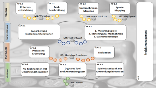 KoSpiRIT ist in die fünf Projektstufen des Mappings, der Modellierung, der Erprobung, des Transfers und der Verbreitung gegliedert (vgl. Abbildung 1). Die Phase des Mappings dient der Schaffung der Grundlagen für den Ausbau von Resilienz in Unternehmen über die Förderung von Verbundenheit durch Maßnahmen der Arbeitsgestaltung und durch kooperative Spiele. Dies geschieht über eine wissenschaftliche und praktische Bestandsaufnahme und eine Feld-Skizzierung von verwendbaren Kriterien, in Frage kommenden Maßnahmen, Spielen und den Erfahrungen damit. Die Ziele dieser Phase sind 1) die wissenschaftliche Bestandsaufnahme aus der Perspektive verschiedener arbeitswissenschaftlicher Disziplinen und Methodenentwicklung, 2) die praktische Bestandsaufnahme und Feld-Skizzierung über Praktiken in Unternehmen und der Beratungslandschaft, 3) die Bestandsaufnahme der Kooperations- und Verbundenheitsstrukturen in den zwei Partnerunternehmen aus der IT-Branche sowie 4) das Erstellen einer Übersicht geeigneter kooperativer Spiele.